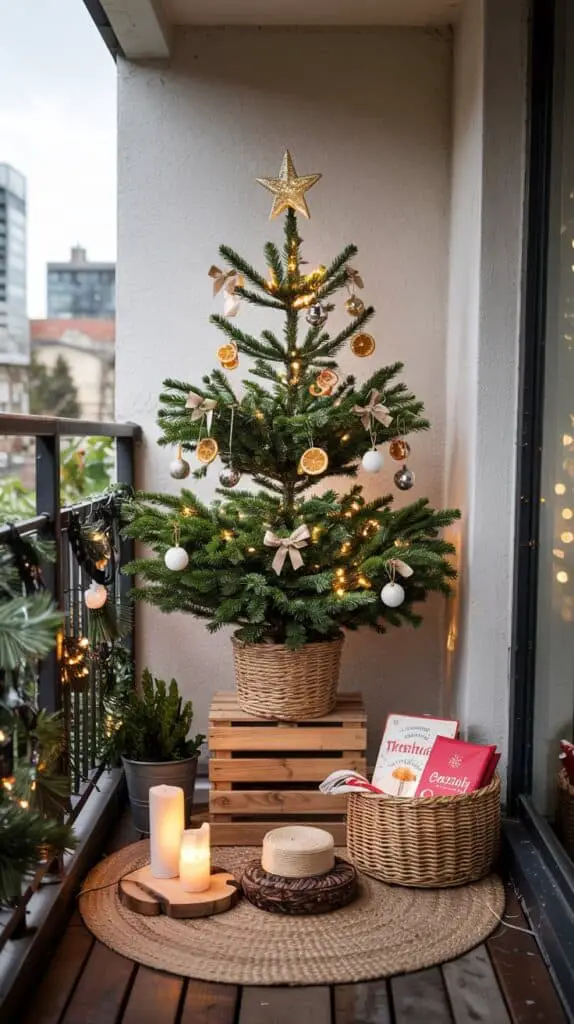 Even the tiniest balcony deserves its own tree. Choose a compact, potted pine or spruce and decorate it with lightweight ornaments, twine bows, or dried orange slices for a natural, rustic look. If your balcony is really tight, try placing the tree on a small stool or crate to elevate it and save floor space.