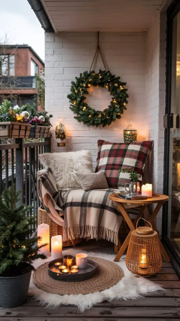 If your balcony has a chair or small bench, it can become your coziest Christmas corner. Add soft, weather-friendly throws, plaid blankets, and textured cushions in deep holiday tones—like forest green, burgundy, or creamy beige. Even if you only use it for a few minutes a day, having a little winter lounge spot feels like a luxury.