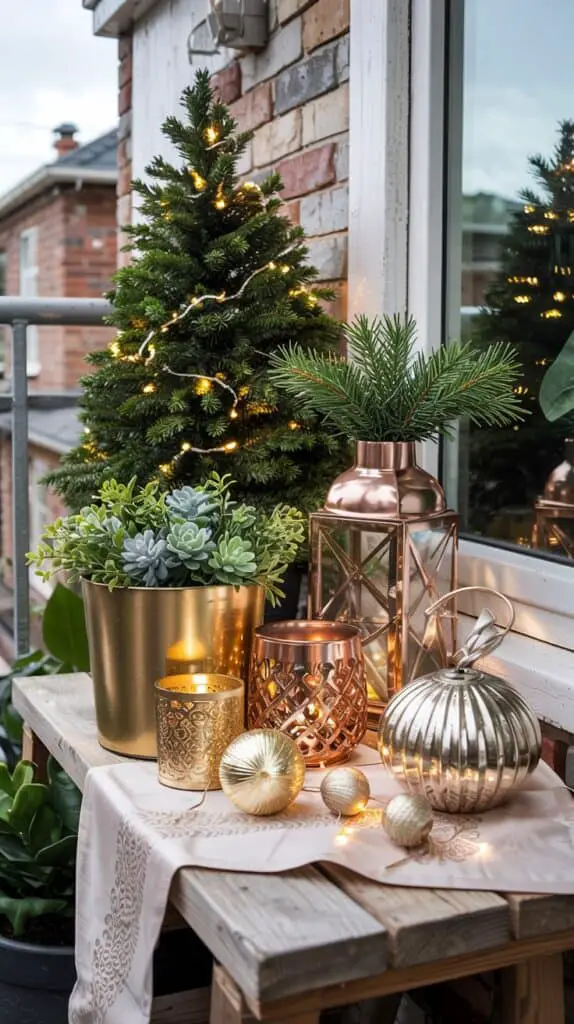 If you love a little sparkle, metallic accents go a long way. Gold candle holders, bronze planters, or a few silver ornaments can make your balcony glow without feeling overdone. Mix metals for a more organic, layered effect—like gold fairy lights with copper lanterns and silver ribbons.