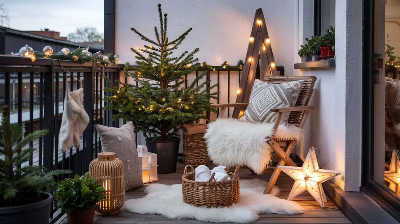 Try a single potted fir tree, a sheepskin throw, and one strand of fairy lights. Add a wooden lantern or a star-shaped light to complete the look. The goal here isn’t more decoration—it’s balance. Even a very small balcony can feel luxurious when it’s neat, intentional, and softly lit.