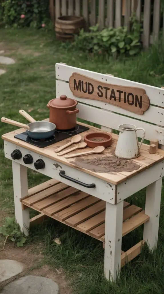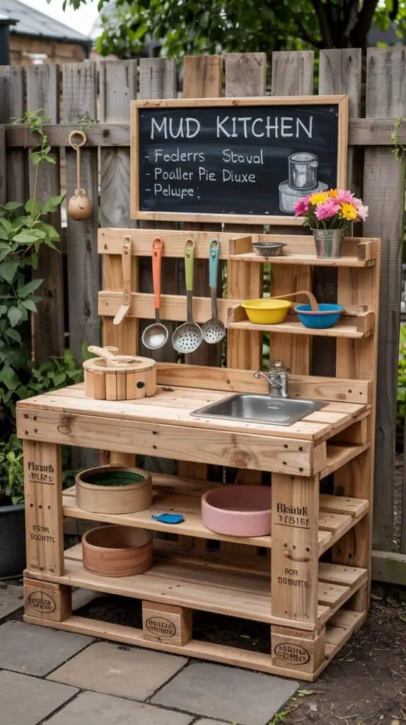 A simple wooden pallet can become a charming mud kitchen almost instantly. Stand it upright, secure it to a wall or fence, and attach a counter made from leftover boards. You can add hooks for spoons, strainers, and little ladles, plus a small shelf for bowls or water containers.