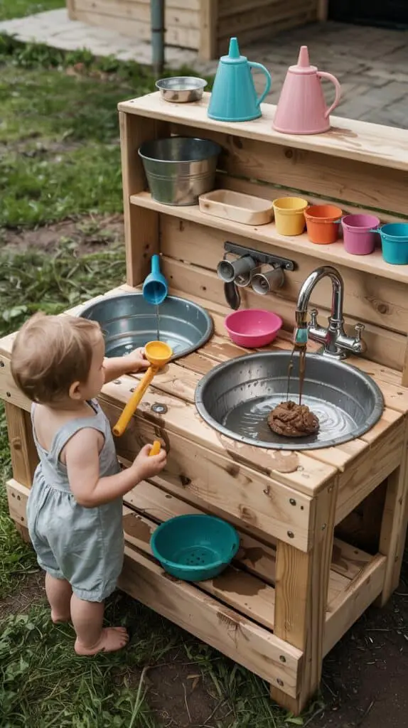 Some toddlers treat mud kitchens like a waterpark, and honestly, it’s adorable (and slightly dangerous for your laundry). If you have one of those splash-happy kids, try using two metal bowls or basins set into a wooden counter. One bowl can hold clean water, the other for “washing dishes,” pouring, scooping, or mixing muddy creations.
