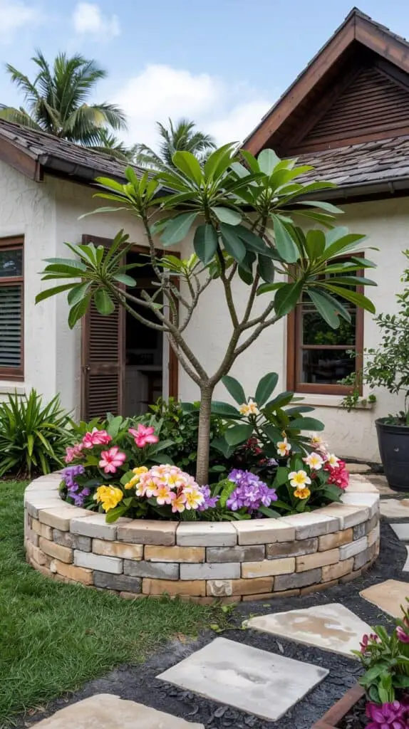 Around it, layer in tropical flowers like hibiscus, Monoi flower (Tahitian gardenia), and purple salvia to add contrast. This setup works especially well near patios, pools, or gravel dining areas in Mediterranean-style homes or bungalows. The plumeria becomes the star, but it plays well with others.