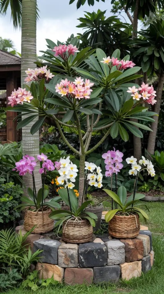 Here’s a trick to make your garden look way more expensive than it is: mix plumeria with tropical orchids in a layered layout. You can plant orchids at the base of the plumeria or place them in rustic hanging baskets from nearby trees or pergolas.