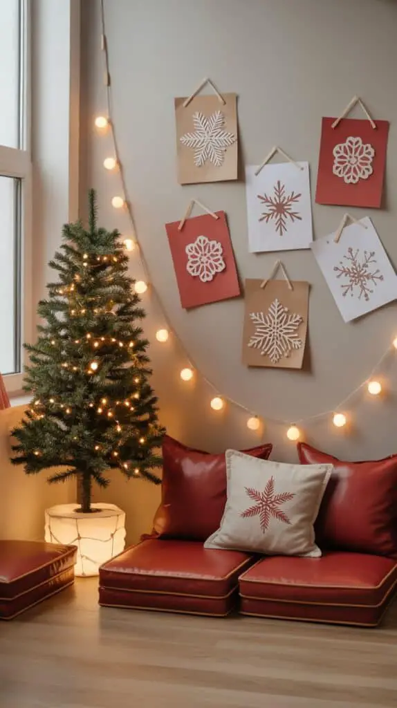 Hang paper snowflakes made by the kids, or let them draw winter scenes on craft paper to display as a backdrop. A simple curtain of silver tinsel behind the reading area can double as a festive photo booth too. For a personal touch, hang stockings labeled with each child’s name or small paper mittens they’ve decorated themselves.
