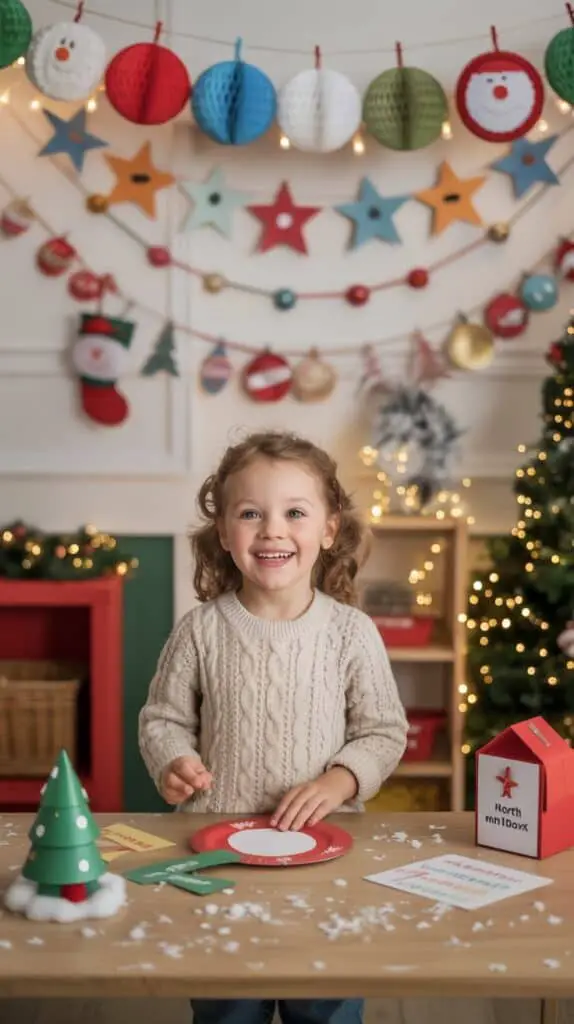 Hang decorations at their eye level — kids love seeing their work up close. Add a “North Pole Mailbox” where they can drop wish lists or kind notes to friends, and sprinkle some (biodegradable) confetti snow around craft tables for a touch of magic.