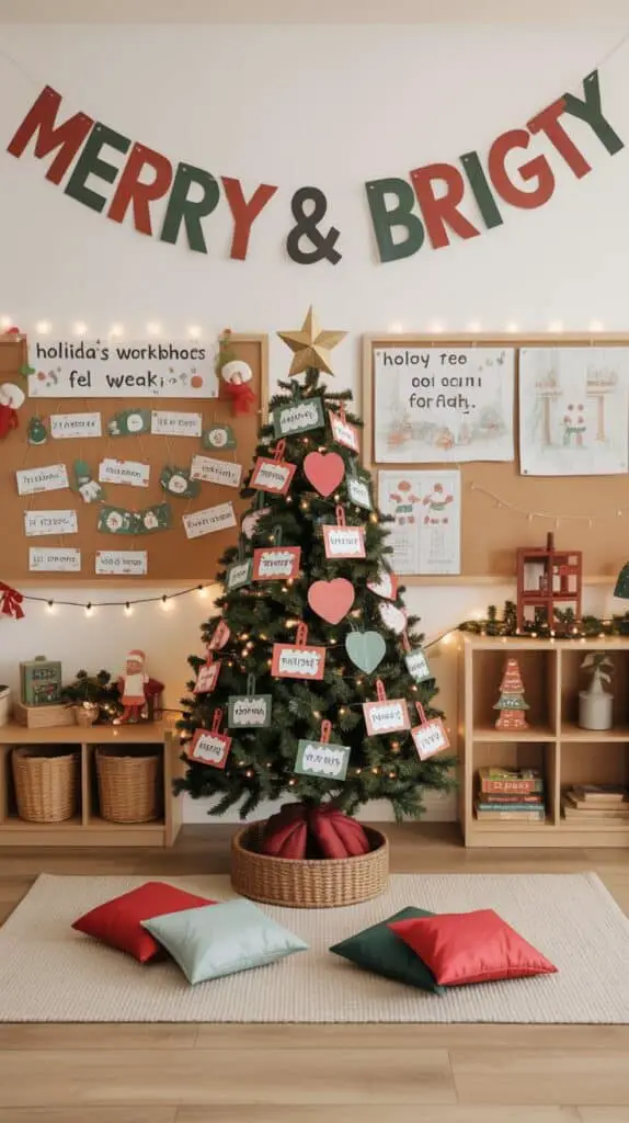 The best school decorations go beyond looking pretty — they make kids feel the holiday spirit. Set up a “Kindness Tree” where children can hang notes about good deeds they’ve done that week. Add a “Santa’s Workshop” craft area where they can make small gifts for family or friends.