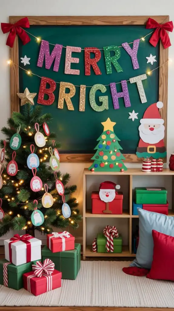 For a final sparkle, hang a big “Merry & Bright” banner across the classroom made entirely from recycled cardboard and glitter paint. It’s cheerful, personal, and reminds everyone what the season is really about — sharing joy.