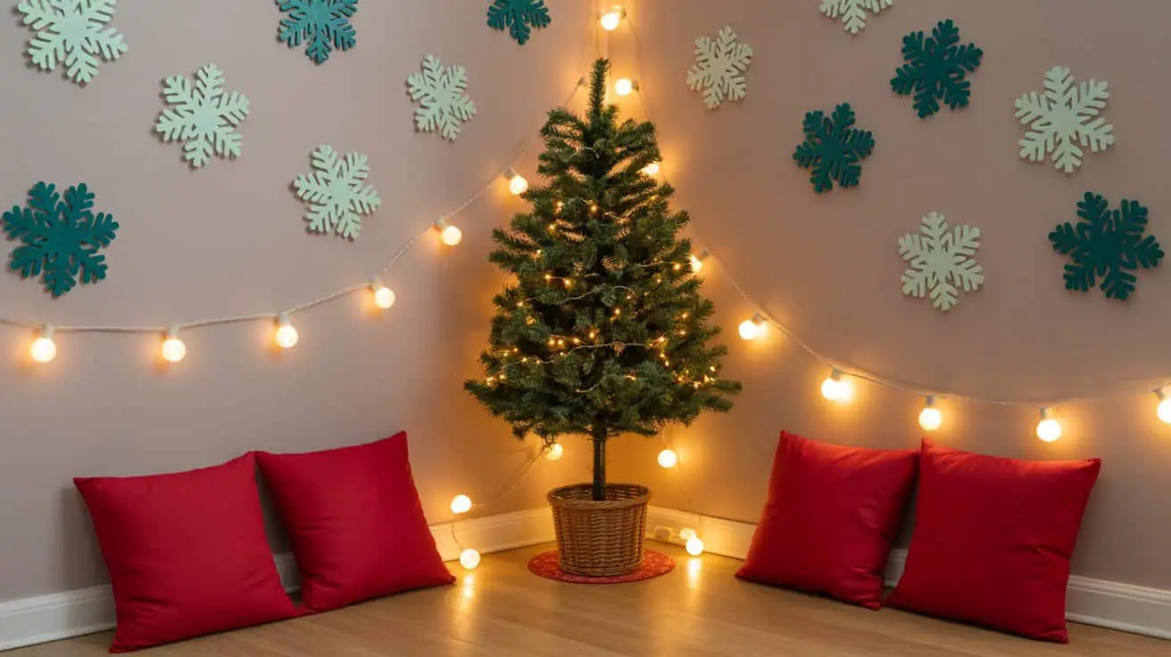 Start small — one magical corner can completely transform the classroom. Choose a reading nook or quiet zone and turn it into a cozy Christmas hideaway. Add a mini tree decorated with student-made ornaments, a soft rug, and fairy lights twinkling along the wall.