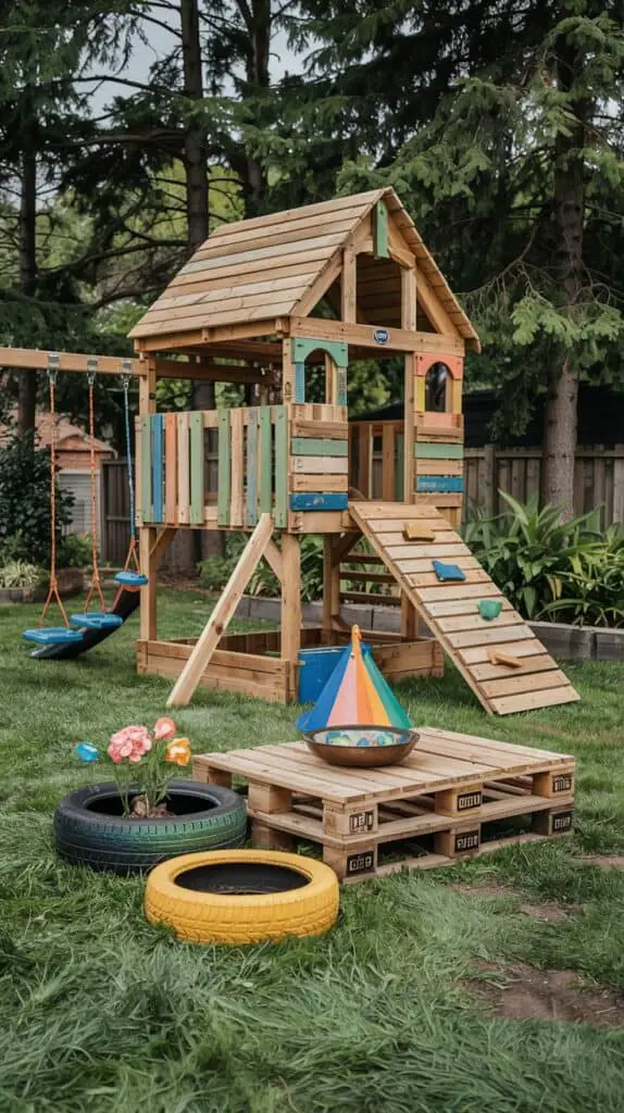 You don’t need to buy new when you can upcycle. Wooden pallets, for instance, are perfect for creating small platforms, play tables, or garden borders around your swingset. With a coat of weatherproof paint, they can even double as mini seating areas or art walls for the kids.