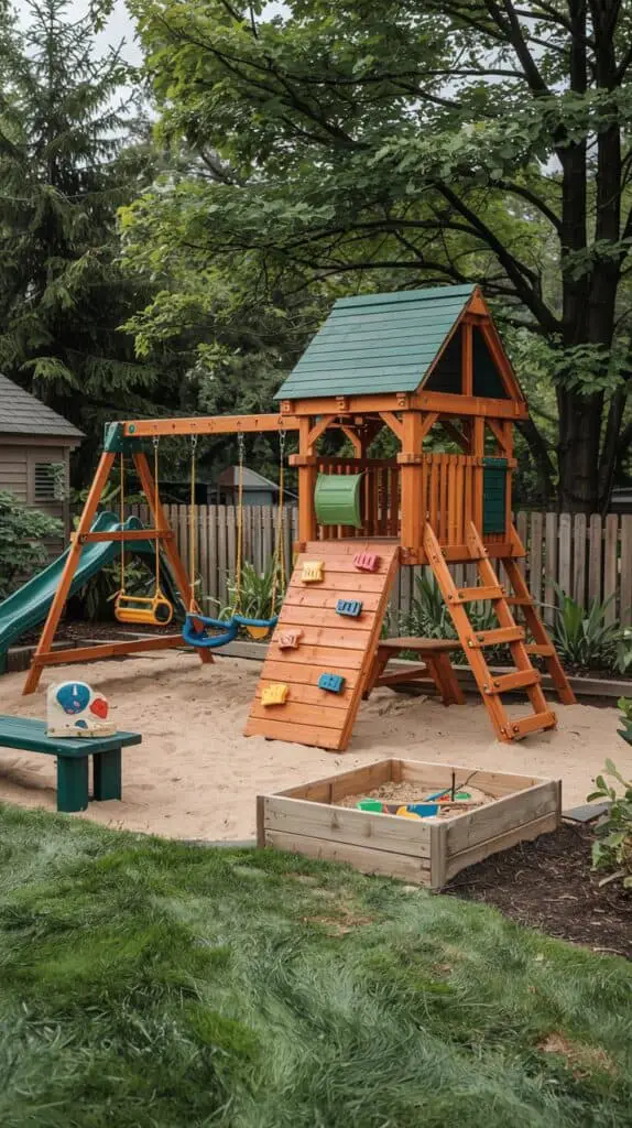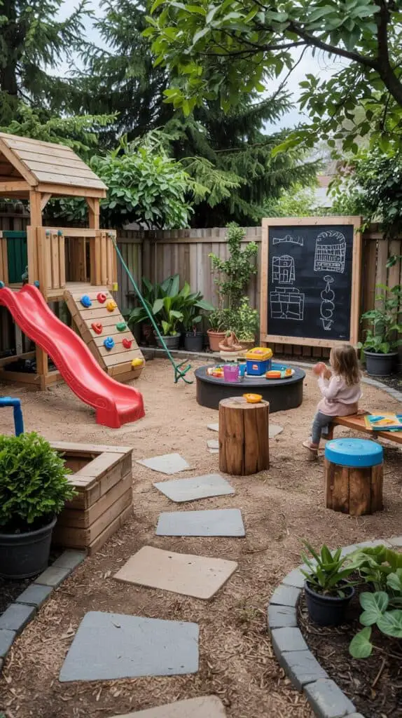 Even a small yard can feel spacious if you divide the area into zones. Create one section for active play (swings, slides, climbing), another for creative activities (sandbox, mud kitchen, chalkboard wall), and a quiet corner with a bench or tree stump seating for reading or snacks.