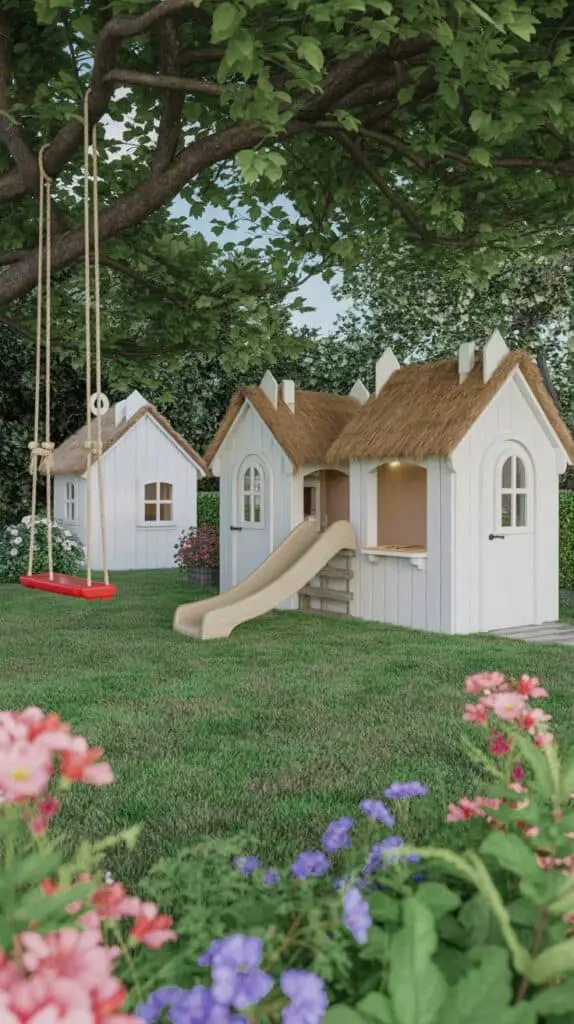 Kids absolutely love things that feel hidden or “secret,” so placing the playhouse slightly tucked behind foliage creates instant magic. Add a few tree-stump seats, a stepping-stone path, and maybe a miniature mailbox for “forest letters.”