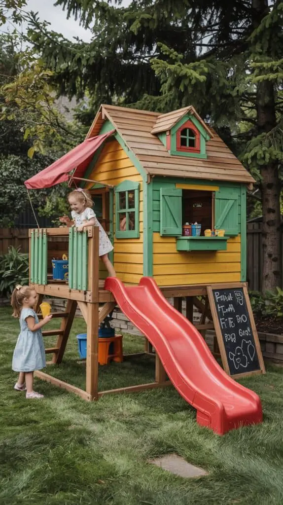 The slide becomes the star of the backyard, while the playhouse gives them a shady spot to relax between bursts of energy. Add a chalkboard wall on one side for doodles, or a little window where they can “sell” pretend snacks or lemonade.