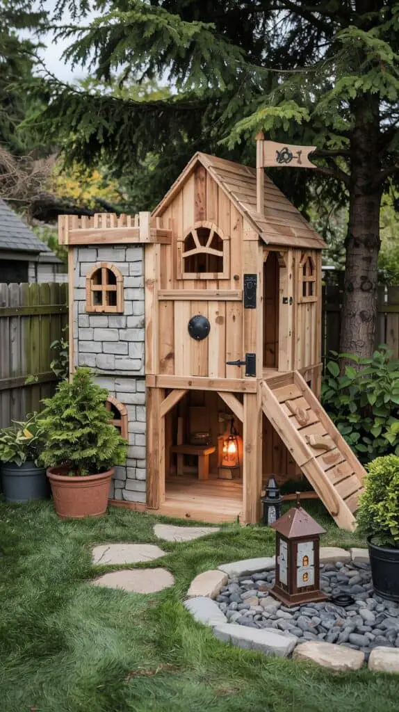 You don’t need to build Hogwarts. A simple wooden playhouse can become a backyard castle with a few clever upgrades: turret-style corners, a faux stone-painted panel, a wooden flag on top, and maybe a little drawbridge door if you’re feeling extra crafty.