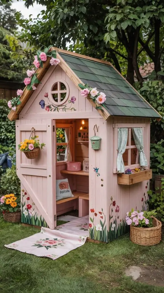 Sometimes all you need is flowers—lots of them. A floral-themed playhouse uses climbing flowers (or faux vines), painted florals on the exterior, a pastel roof, and little decorative details like butterfly decals or tiny lanterns.