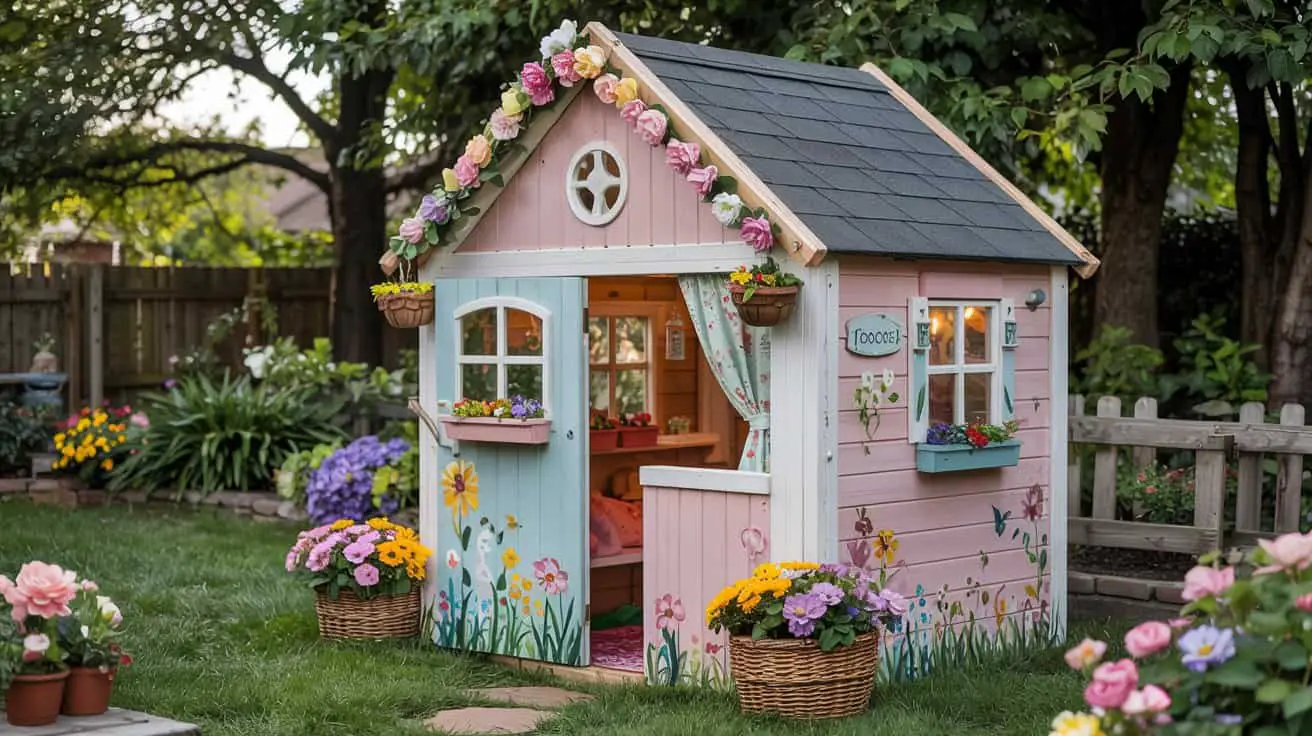 Sometimes all you need is flowers—lots of them. A floral-themed playhouse uses climbing flowers (or faux vines), painted florals on the exterior, a pastel roof, and little decorative details like butterfly decals or tiny lanterns.