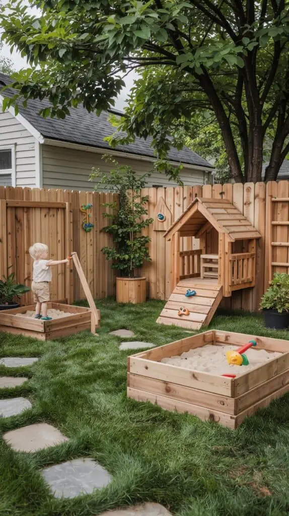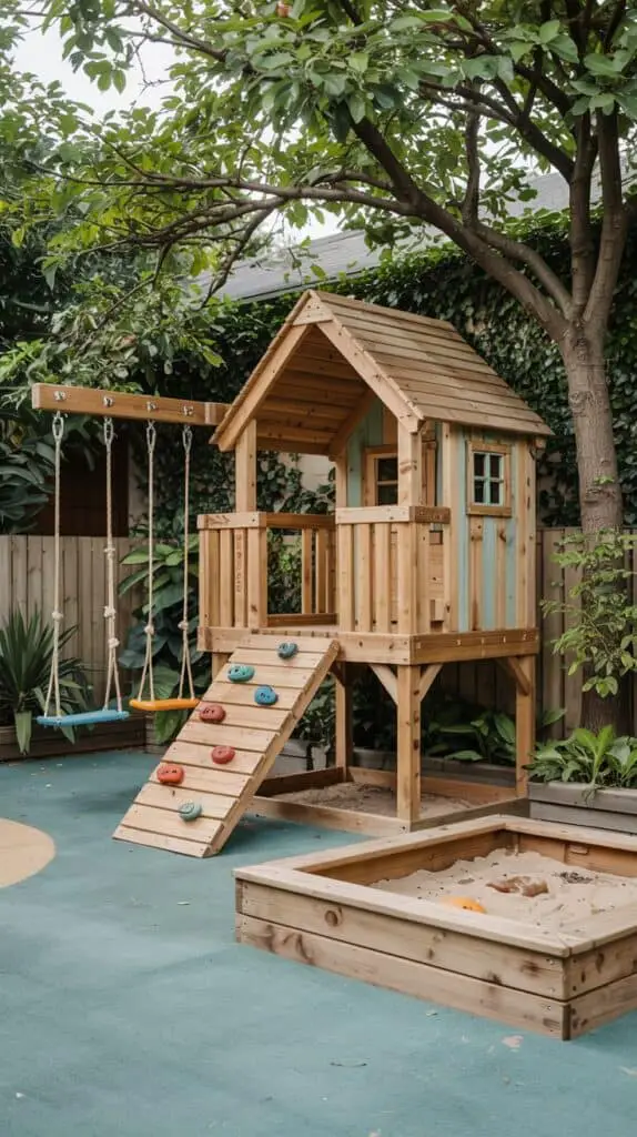 That’s why this kind of simple, wooden, nature-leaning outdoor setup works so well. Picture this: a wooden sandbox made from light-colored lumber, a cozy little playhouse tucked under a big oak branch, a climbing wall that isn’t huge but still exciting, and a couple of rope swings hanging from a sturdy beam. All of this fits into a compact space—and here’s the best part—it still feels open, inviting, and calm.
