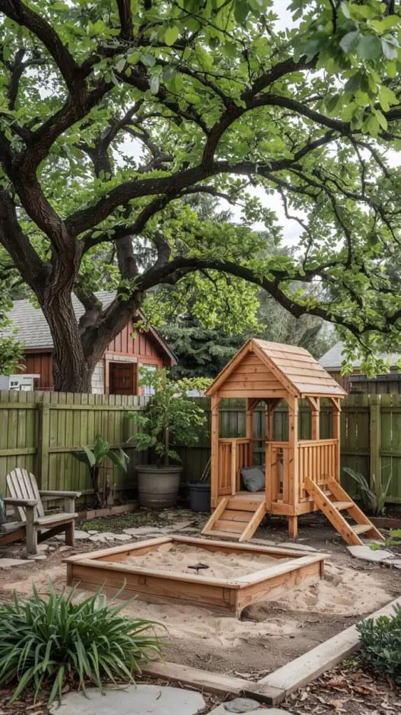 That big oak branch is more than pretty. It’s practical. It gives natural shade over the sandbox and playhouse so your kids can play outside longer in summer without overheating.