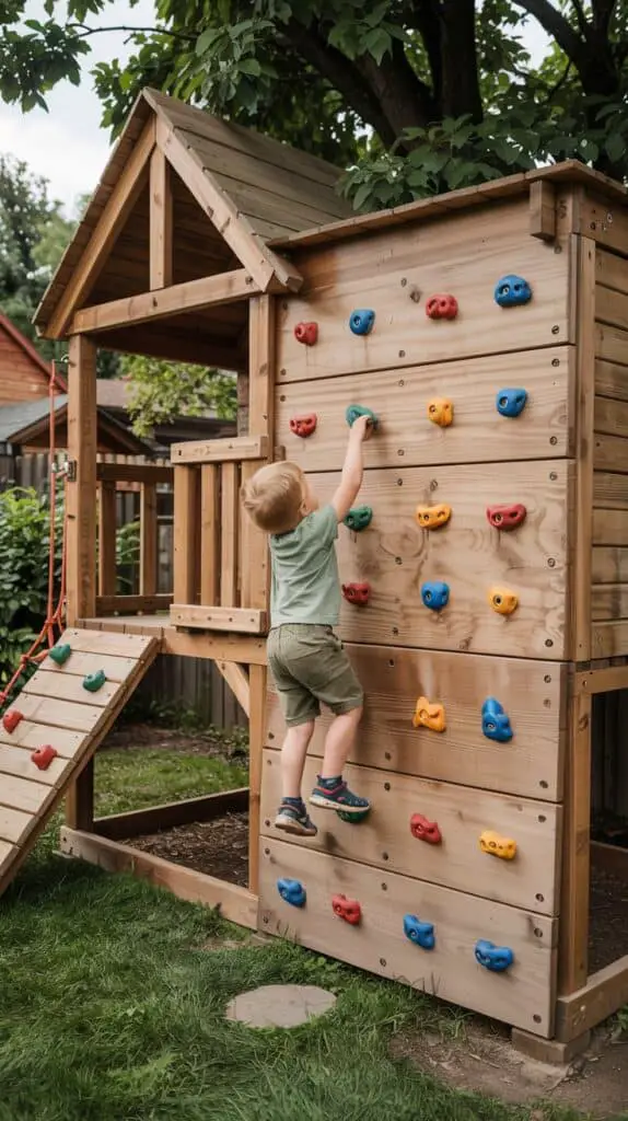 On the right side, a wooden climbing wall is mounted with bright red, blue, and orange holds. This is one of the smartest DIY playground backyard ideas because it: