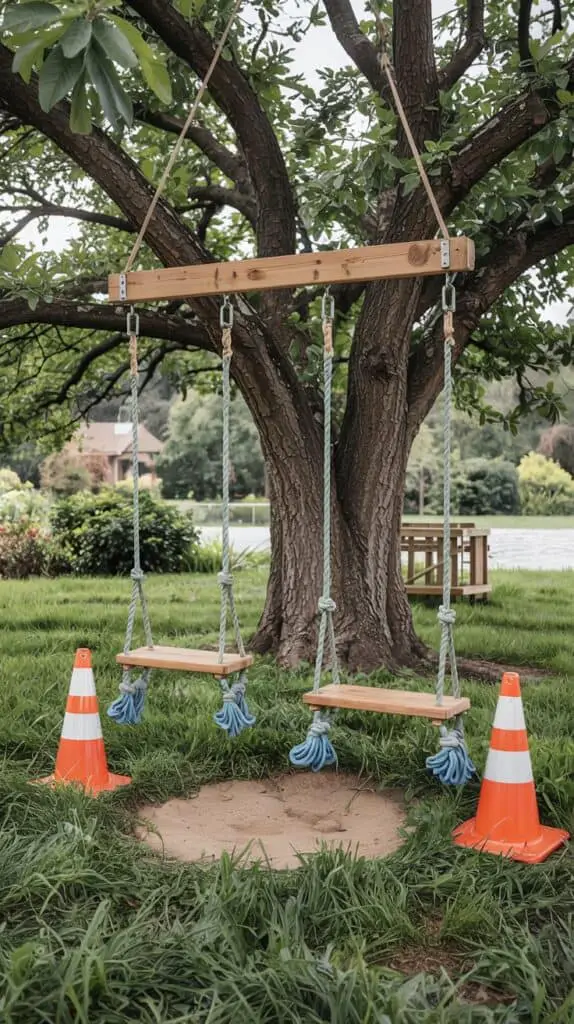 Add a pair of orange safety cones (yes, they’re in the photo!) and suddenly the swings look like a mini adventure station. Kids love it.