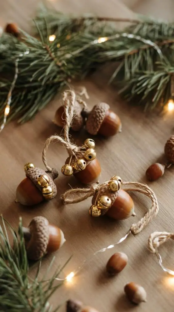 Use acorn caps as tiny bowls to hold mini bells, beads, or small wooden stars. Kids can glue a string inside the cap and create nature-inspired charms for door handles, gift wrapping, or Christmas stockings. It’s simple, calming, and great for sensory play.