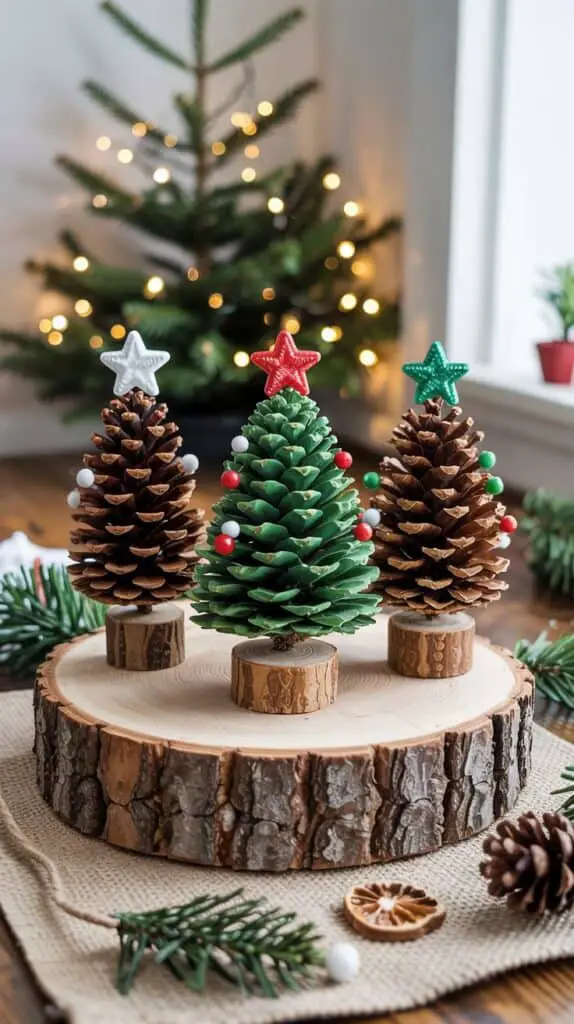 Pine cones make perfect tree shapes. A quick dab of green paint (or leave them natural), add tiny pom-poms or bead ornaments, and glue the cone onto a wooden slice or cardboard base. Kids love decorating these because each one ends up looking different.