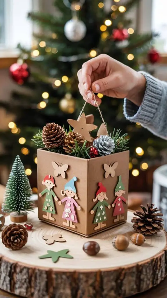 End the night by decorating a small cardboard box with pine cones, acorns, twigs, and butterfly cutouts. Kids can store their miniature creations inside—like elves, fairies, and bells—making it a gentle ritual that wraps up the craft evening.