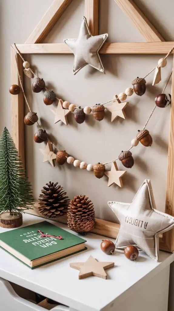 Thread acorns, small pine cones, paper stars, and wooden beads along a twine string. Kids love choosing the order of the pieces, and the final garland looks beautiful hung above a bed or craft table — especially during holiday sleepovers.