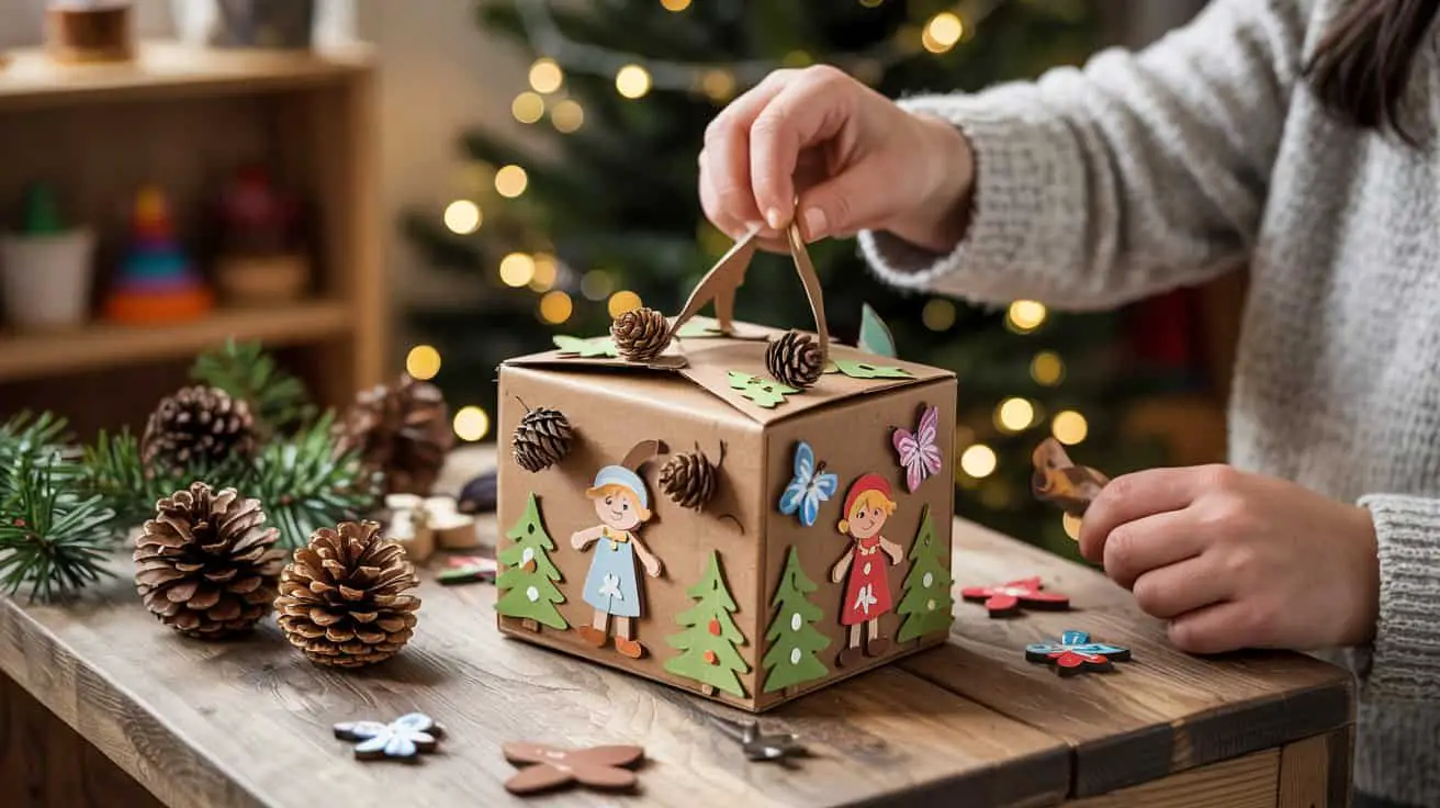 End the night by decorating a small cardboard box with pine cones, acorns, twigs, and butterfly cutouts. Kids can store their miniature creations inside—like elves, fairies, and bells—making it a gentle ritual that wraps up the craft evening.