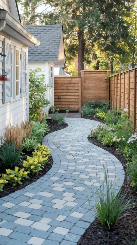 If your yard has awkward corners (mine has about eight), a gentle curve helps guide the eye and makes small gardens feel bigger. Curved walkways look expensive but use the exact same budget pavers—you’re just laying them in a friendlier direction.