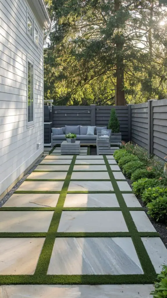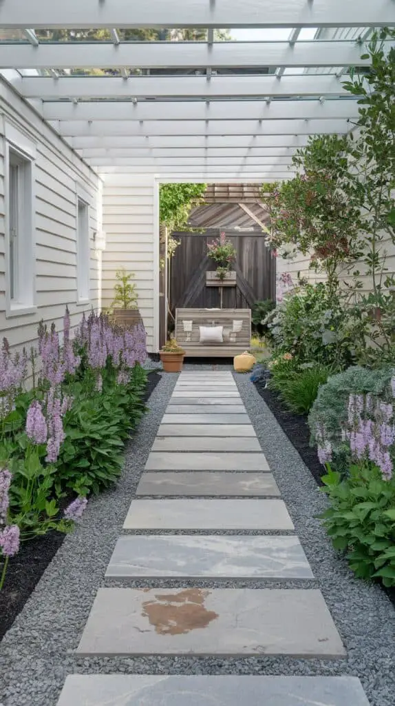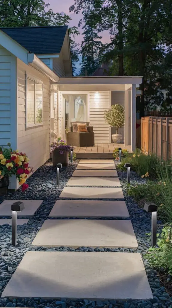 One of the easiest ways to save money is to use large pavers surrounded by gravel instead of filling the entire walkway with stone. The gravel fills in gaps, drains rainwater, and gives the whole thing a breezy, modern feel. Add a few stepping-stone gaps and kids will treat it like a tiny adventure path.
