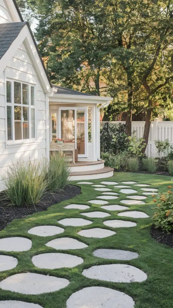 If you want the most affordable option, go for widely spaced stepping stones settled into grass, gravel, or mulch. It gives your yard a gentle, whimsical look and works beautifully in play-friendly spaces where children tend to dart around. Bonus: fewer stones = fewer things to install.
