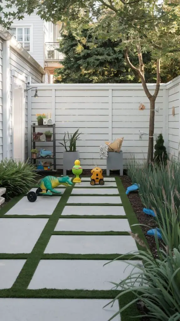 Grays, beiges, and soft browns blend easily with any garden style, especially if you’ve got toys, sports equipment, or the occasional dinosaur sprinkler scattered around. Neutrals calm the chaos and make everything look intentional, even if it’s not.