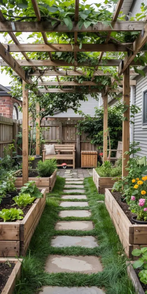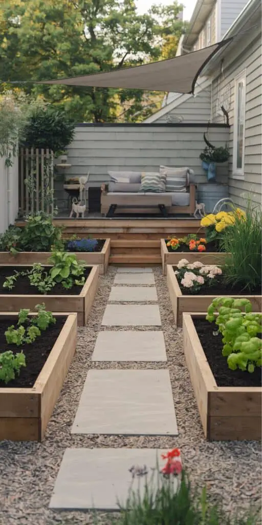 This is a quiet but powerful part of Raised Garden Layout thinking: the path makes the whole setup feel intentional, and it keeps kids from cutting through beds. It also helps with muddy shoes—if you can walk from the door to the play area and the garden without stepping through soil, you’ll actually use the space more.