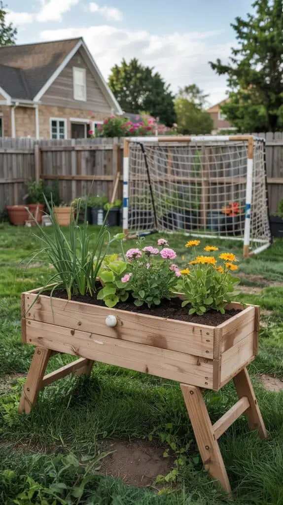 A waist-high raised bed (or even a long trough-style planter on sturdy legs) behind a small soccer goal or open play area does a few things: