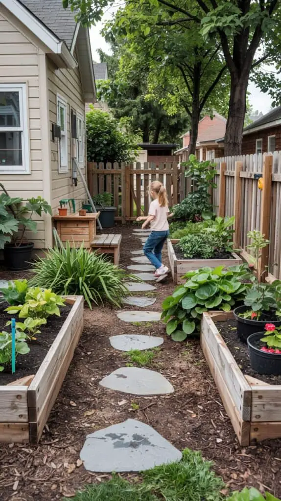 - Put a narrow path (pavers, stepping stones, or even mulch) between the beds and the play zone so you’re not walking through dirt constantly.