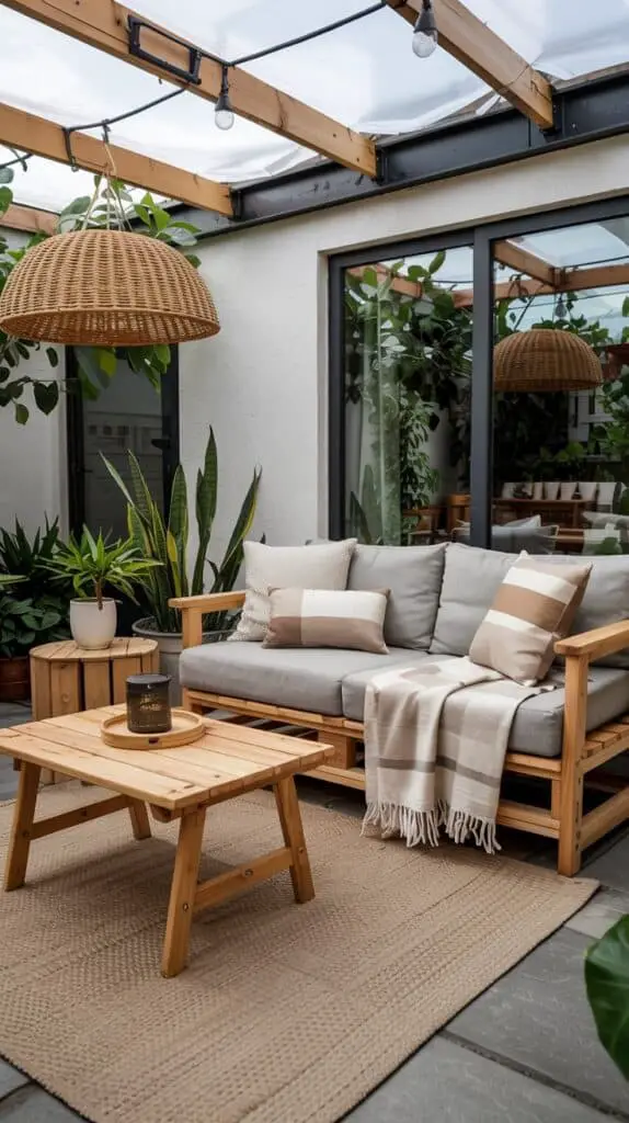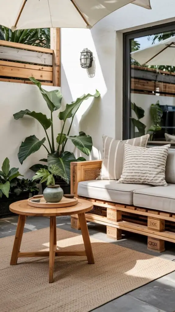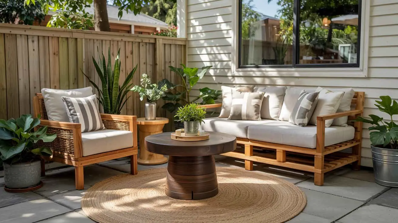 You don’t need matching furniture sets (actually… please don’t buy a matching set). Mixing natural wood pieces — a small teak side table here, a bamboo tray there — adds warmth and that designer “collected over time” look. Even one inexpensive wooden bench instantly makes a patio feel more upscale. And if you’re on a super tight budget, raw pine or pallet wood can be sanded and oiled to look far more expensive than they cost.