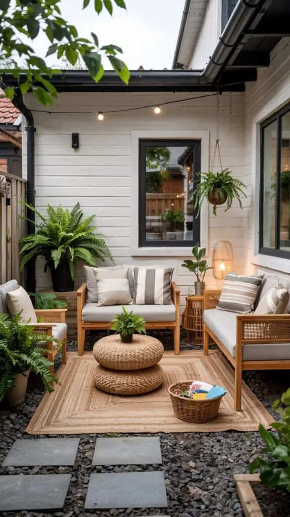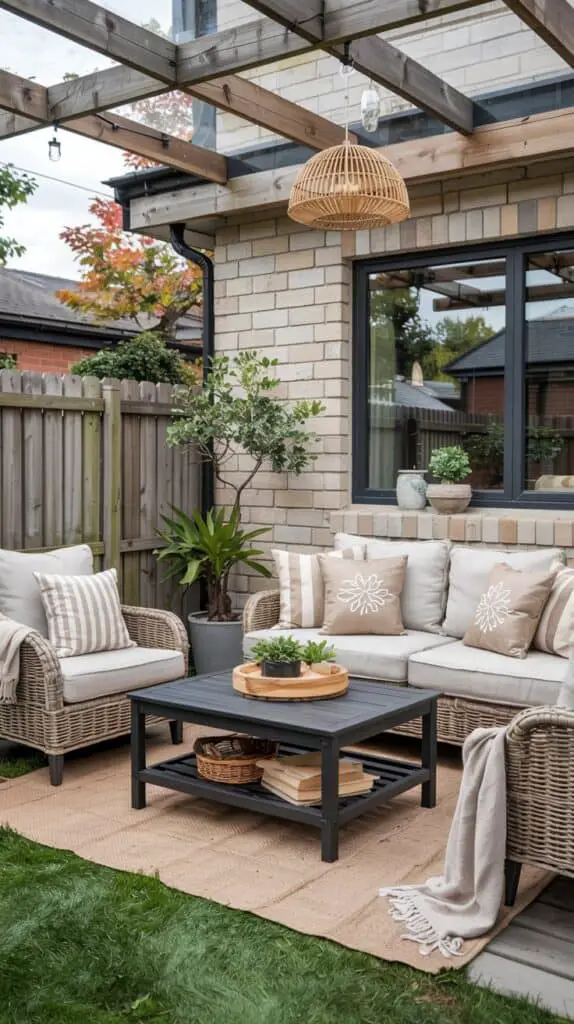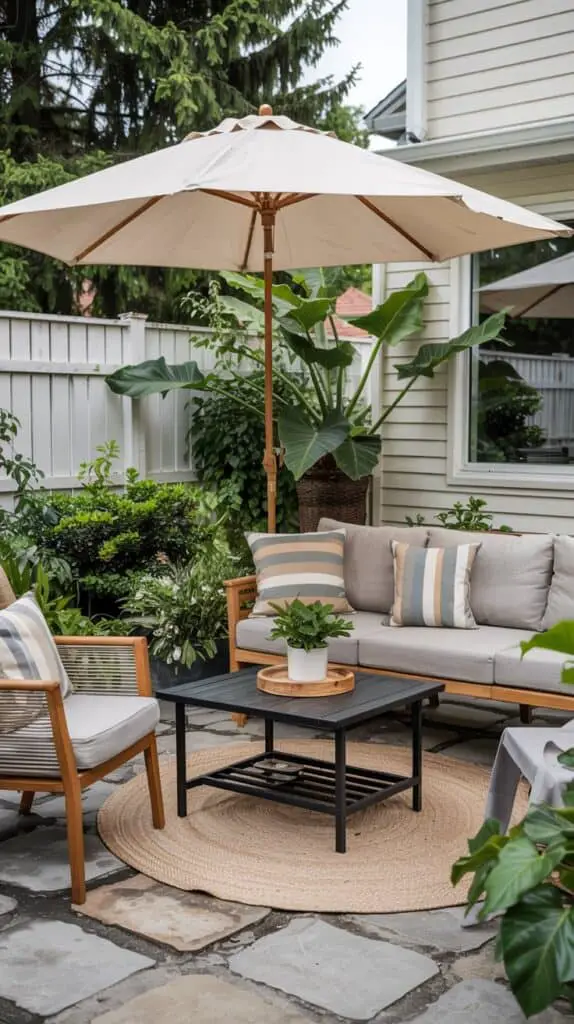 One of the quickest ways to make a patio look polished is simply dividing it into zones. A comfy seating zone, a play zone, and maybe a little coffee corner if you’re lucky. You don’t need fancy dividers either — an outdoor rug works magic. Pick something neutral, maybe with a small pattern to hide crumbs and kid snacks. Suddenly the space feels intentional, not random.