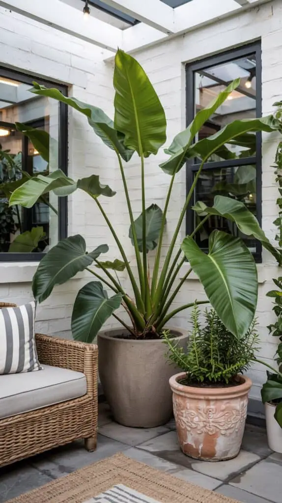 Large plants — not lots of plants — are what make patios look high-end. Instead of cluttering the corners with tiny pots, choose one or two statement plants. A tall fern, a banana plant, even a big pot of rosemary. The height makes everything feel more intentional, and it gives a patio that resort vibe without costing a plane ticket.