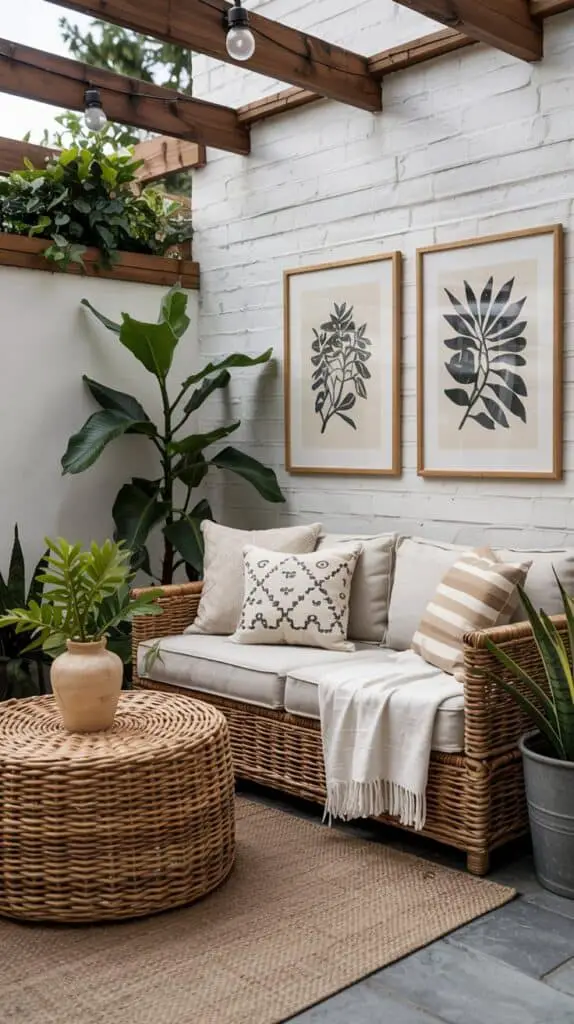 This doesn’t mean dragging your living room outside, but a few indoor-inspired pieces can elevate the patio instantly. Think: a woven basket for blankets, a cute ceramic vase (that you bring inside when it rains), or framed outdoor-safe prints. Too many and it becomes cluttered, but one or two well-chosen pieces add personality and a high-end feel.