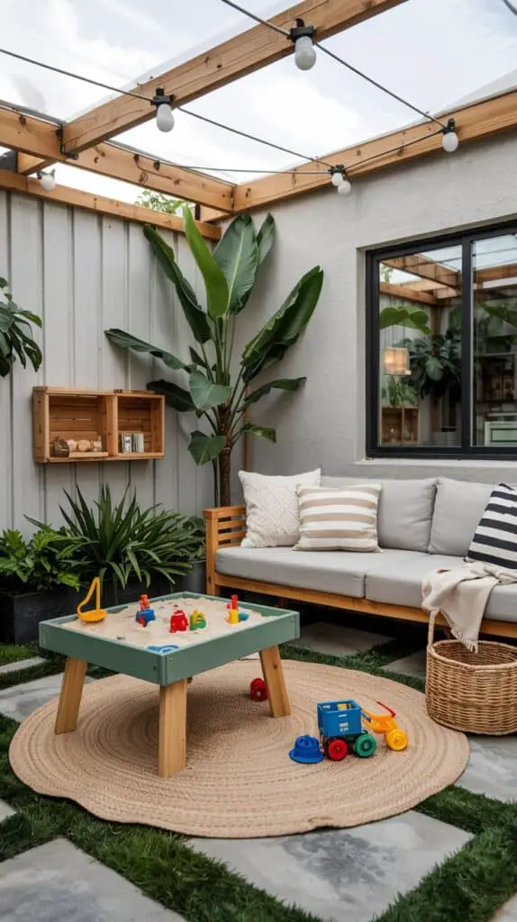 You don’t have to choose between beauty and play. A small sand table, a tidy toy basket, or even a single outdoor mat for building blocks gives kids their designated zone — and keeps the rest of the patio looking calm. Choose neutral colours so the area blends in instead of taking over.