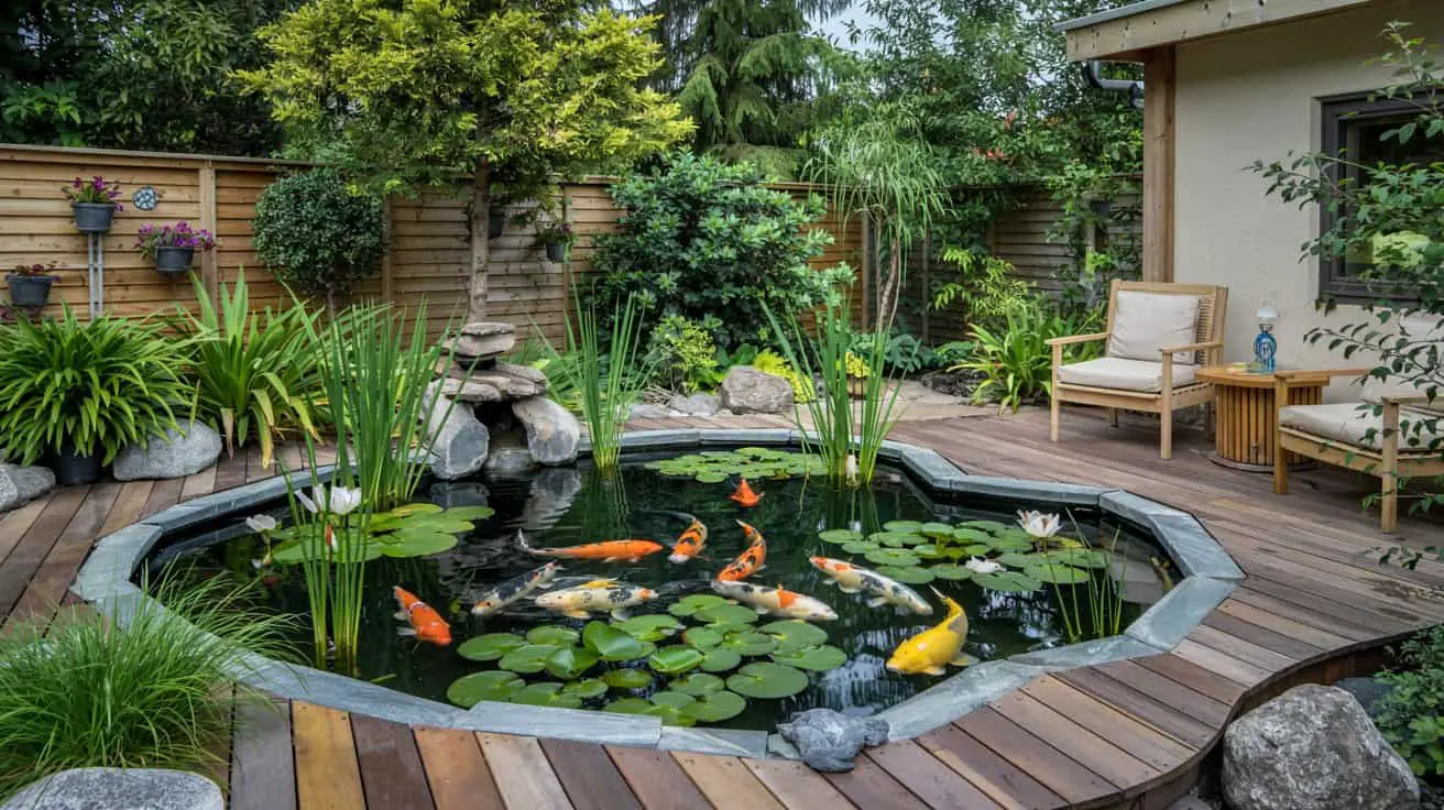 Koi ponds pair beautifully with small wooden decks or pergolas. It creates that seamless transition between your yard and the water. Surround the pond with plants like bamboo, reeds, or low grasses for a natural feel. If you’ve got little ones, consider a shallow safety ledge inside the pond so no one gets too close to deep water.