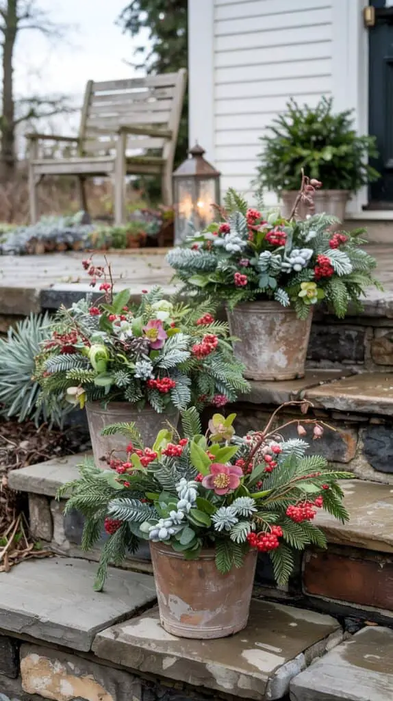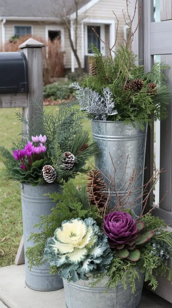 You don’t have to landscape the whole yard—sometimes all it takes is a few winter flower arrangements in the right places. Use containers you already have (even a galvanized bucket works), and fill them with a mix of seasonal greens like cedar or fir, plus winter florals like cyclamen, dusty miller, and ornamental kale. Throw in a few pinecones or branches for height, and you’ve got a no-fuss winter floral arrangement that looks good all season.