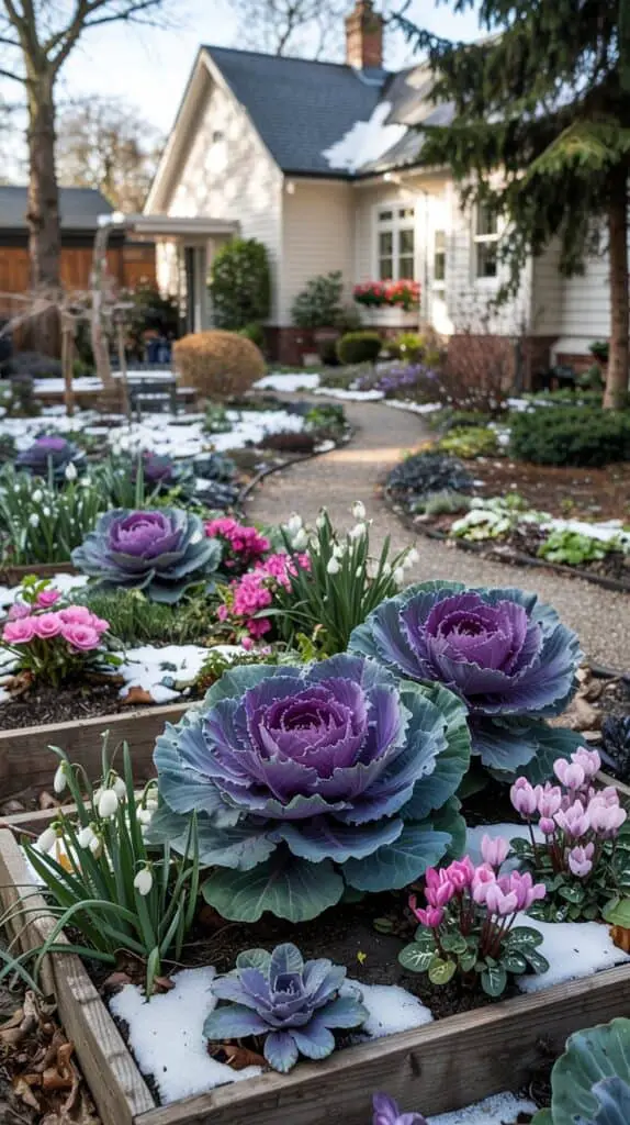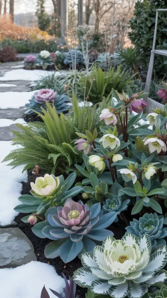 Before you get to flowers, think about winter-hardy plants that create a green backdrop. These are your anchors—plants like hellebore, evergreen ferns, and ornamental cabbage. They add texture and structure so the actual flowers don’t have to work so hard to make an impact. Hellebores, sometimes called the “Christmas rose,” are ideal. They bloom in shades of pink, white, and deep plum from late fall to early spring, even when there’s snow.