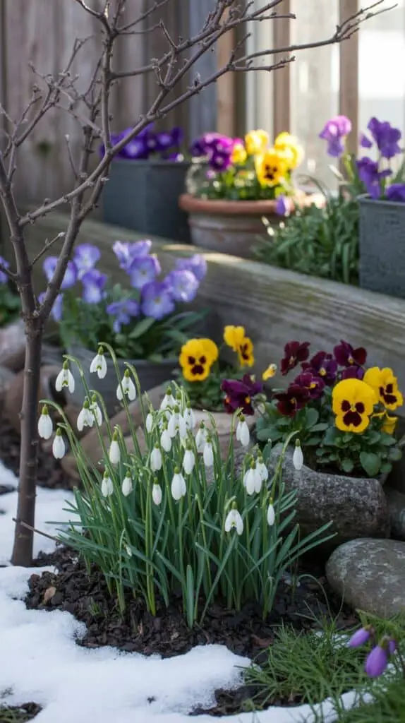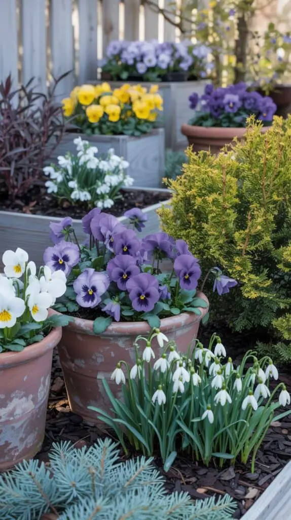 If you’re unsure how to make winter flowers look good together, the trick is simple: pick three colors and repeat them throughout the yard. For example, deep purple, white, and soft yellow. Use pansies, snowdrops, and dwarf conifers to hit those tones and repeat the combo in different containers or bed areas.