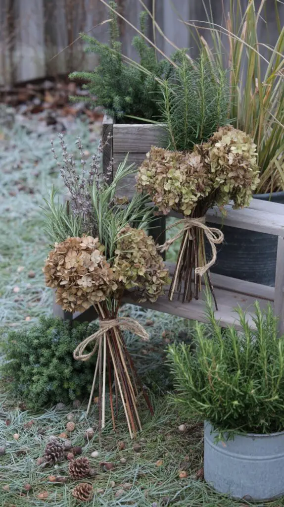 Not every flower in your yard needs to bloom to be beautiful. Add contrast and depth using dried flower stems and evergreen accents like rosemary, boxwood, or even lavender that’s been left to go woody. These give the illusion of life and detail, and they hold up through wind, frost, and forgetful watering.