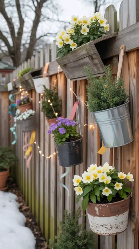 If climbing plants aren’t your thing, hang small containers or repurpose old wall planters with low-cost winter plants like violas or dwarf conifers. A few lights or ribbon scraps make it festive without getting holiday-specific.