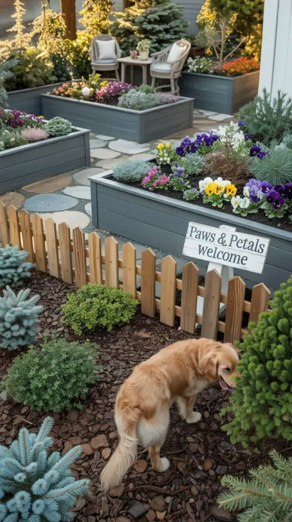 Even adding a small DIY pet-themed garden sign can make the space feel intentional and family-friendly while helping keep paws off delicate areas.
