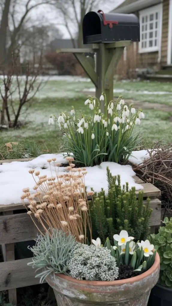 Remember, winter landscaping doesn’t have to look perfect. It just has to feel cared for. A few snowdrops peeking out near the mailbox. A repurposed pot filled with dried seed heads and tucked greenery. A section of your front yard that holds color when everything else fades.