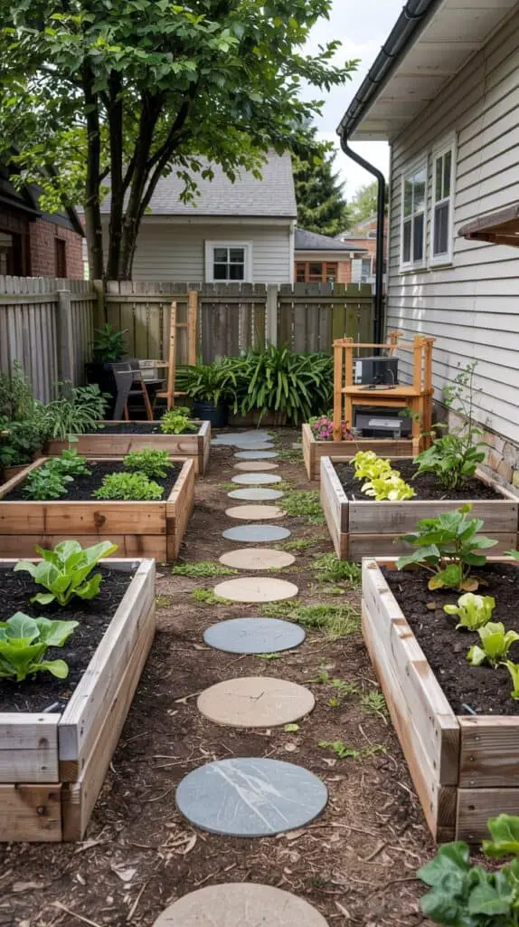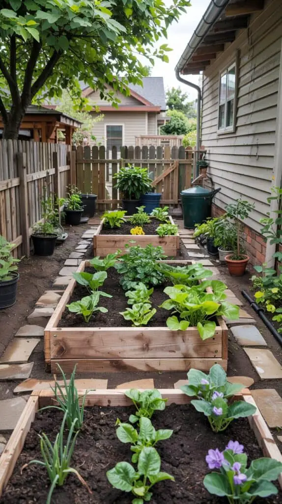 Spacing matters. Leaving clear walkways between raised garden beds makes the side yard feel organized and easy to navigate. Mulch, gravel, or stepping stones help define the space without adding clutter.